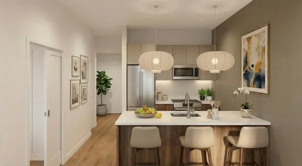 现推出多种户型,包括 Studio(开间)、一居室、两居室及三居室公寓单位。所有户型均配备约10英尺层高及近8英尺高的大面积窗户,整体空间通透明亮。室内采用高端装修标准与优质品牌家电,部分单位配备 LG 或 GE Profile 洗衣设备。厨房配备 GE Café 及 Samsung 高端系列电器。二层、三层及顶层(四层)单位均带有私人阳台,部分单位拥有双阳台设计。一层整体抬高于地面之上,呈现出类似高端城市褐石建筑(Brownstone)首层的尊贵格调。
